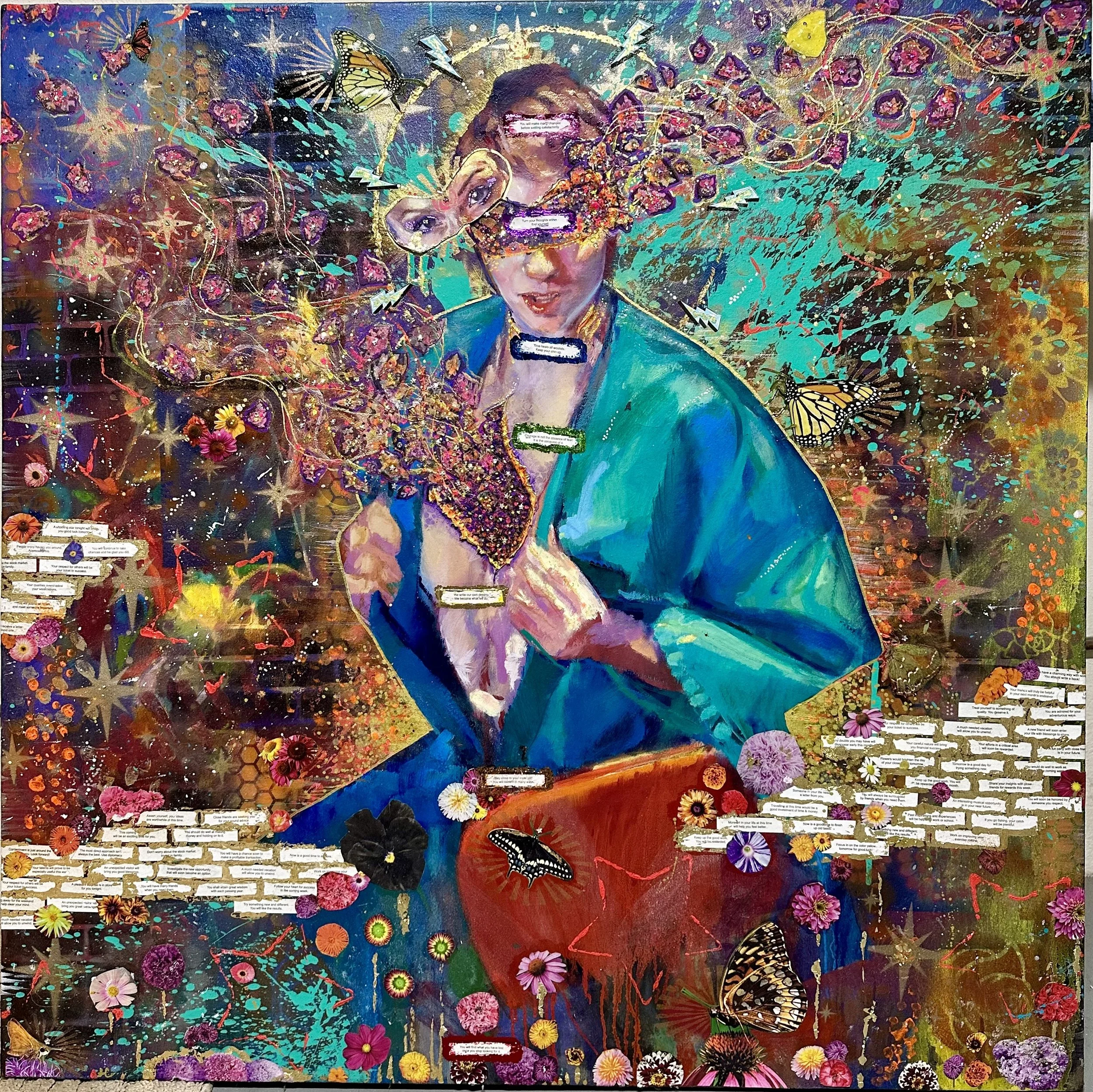 Artist for the Month of February is Laura Coppinger, local face painter and artist. She’s been face painting since 2014 but only in recent years has she been working on art pieces that feature acrylic and collage. She was recently named The People’s Choice Artist for the Chasing the Light Art Show at Soulard Art Gallery with her piece Break Through. She is honored to hang her collection at Luvwoo Bar as she continues her creative journey. Follow her on Instagram at @sparklemotionlaurafor updates and commissions.